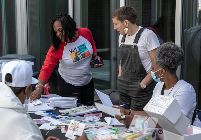 Chicago Public Media Chief Audience Officer Celeste LeCompte (standing, on right) and organizers with the Women’s Justice Institute staff a letter-writing station Saturday at WBEZ’s “Outside Together” event for children and families with loved ones incarcerated in Illinois.