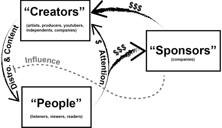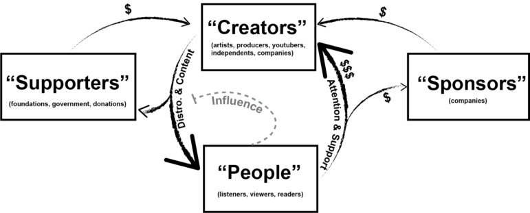 But today, the internet has removed the distributors from the equation. Self-distribution is now the norm. Because there’s no public support of independent creators, the “supporters” are gone as well. We’re left with sponsors who fund creators directly and want to capture as much attention as possible, which leaves creators vulnerable to strong influence from advertisers, or left out in the cold. Today the ecosystem looks like this: