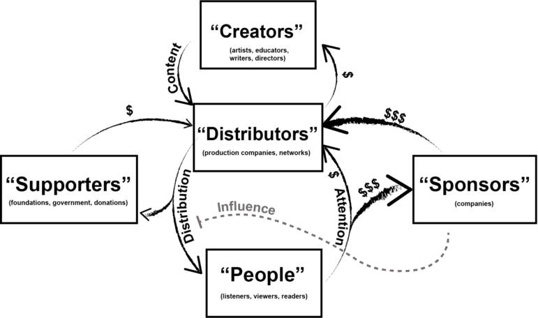 What drives a media ecosystem? In a media ecosystem, you have media producers (creators) and media consumers (audiences). You also have production companies and networks (distributors) and money (advertisers and supporters). It’s natural to assume that money drives the system.