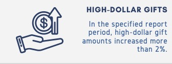 The moderate Membership revenue increase was driven by TV/Joint licensees, which enjoyed a 2.2% increase in revenue. Radio was essentially flat, with a little more than 1% decline. Stations of medium size (15,000–40,000 12-month donors) once again outperformed stations of other sizes, with a %2.7 lift in revenue. This group of stations again experienced the strongest growth in high-dollar gifts at 9%. Overall, the High Dollar Index saw a nearly 1% increase in gifts this period.