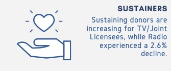 Sustaining donors have been a bright spot for new donor acquisition. In other CDP reporting, we have seen since the days of COVID quarantines that both TV and Radio have growing shares of new donors making sustainer gifts. In the most recent period, TV/Joint licensees had 38% of all new donors making sustainer gifts, and Radio surpassed 30% for the first time since the pandemic.