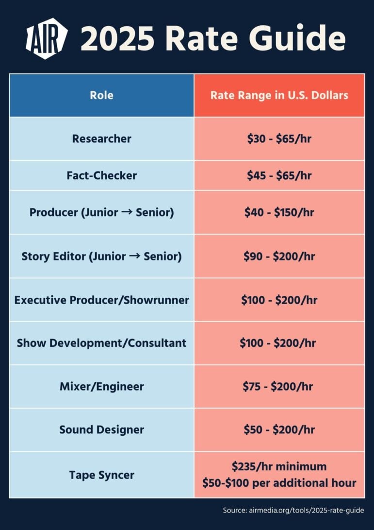 AIR has just released its updated rate guide — a reference document designed to help independent producers, fact-checkers, researchers, editors, sound designers, engineers and consultants better understand fair rates and negotiate confidently. It also serves as a resource for hiring organizations to develop realistic budgets.