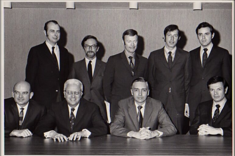 Gwathmey at upper left at the incorporation meeting for NPR, held at CPB in 1970. Also pictured standing left to right: Karl Schmidt, David Putts, Marvin Segalman and Bill Kling; seated left to right: Dick Estell, John Macy Jr., John Witherspoon and Bernard Mayes.