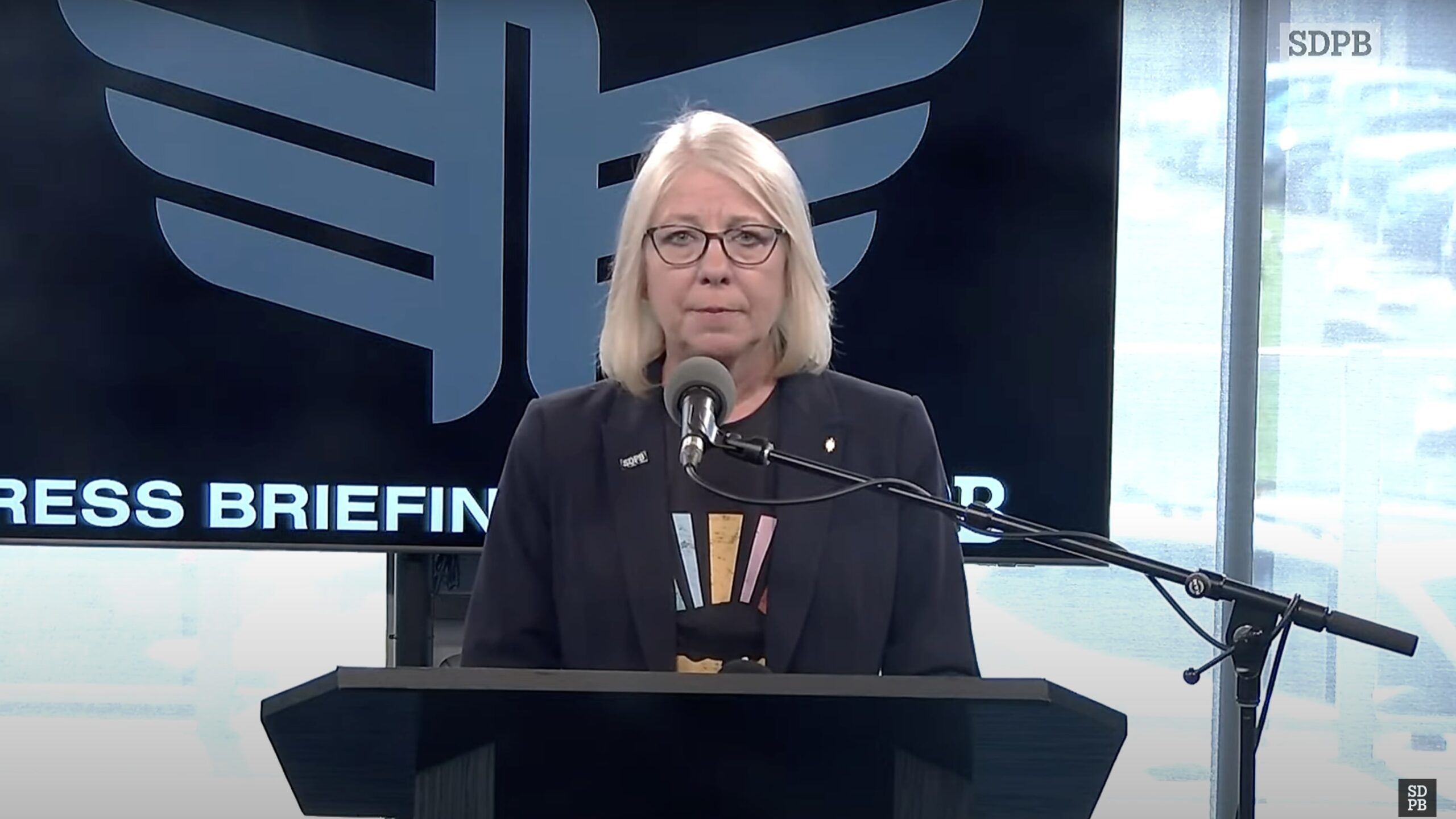 SDPB Executive Director Julie Overgaard discusses the state network's workforce reduction at a press conference Thursday.