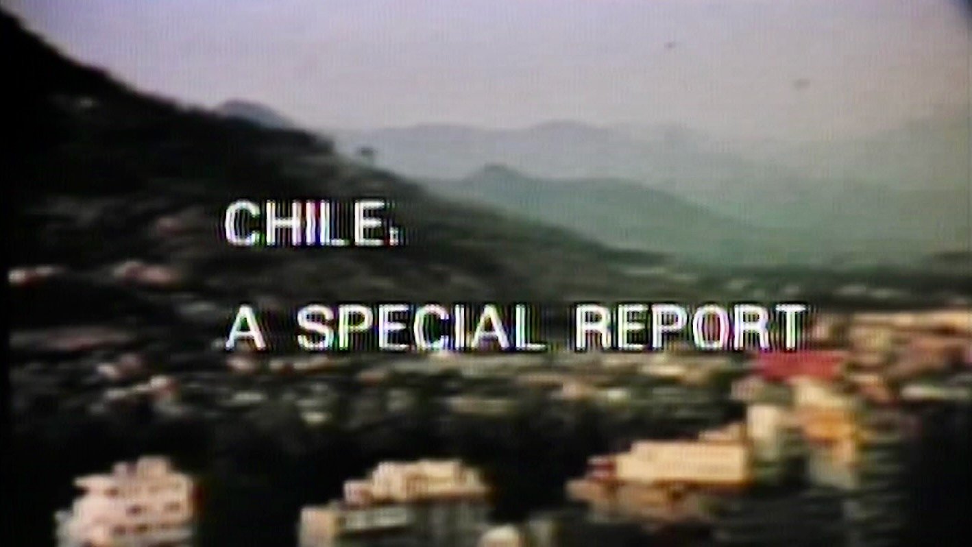 Grainy television title card with blurred city buildings and hills in the background. White block text across the center reads: “CHILE: A SPECIAL REPORT.”