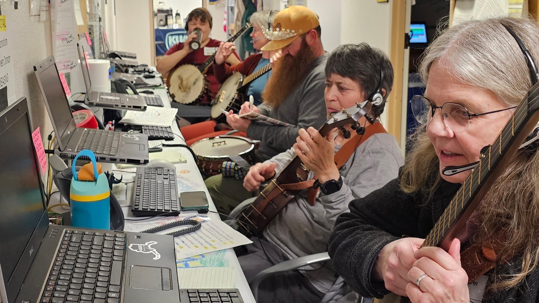 The Banjo Phone Bank, a collection of banjo-playing KUAC supporters, answers pledge phones during the station’s fall fundraiser.