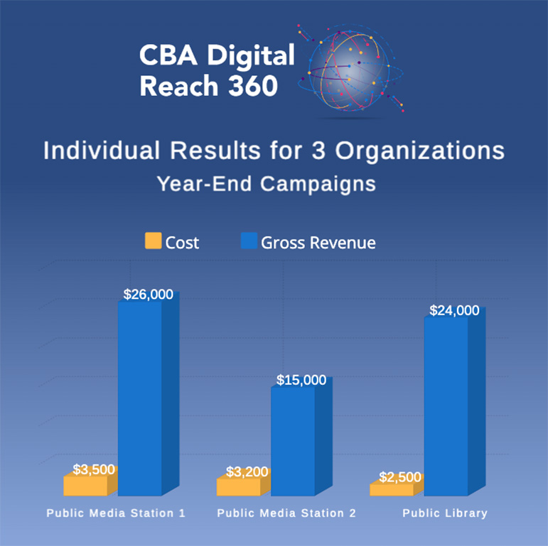 Since writing our previous article, we have gathered fundraising results from six CBA Digital Reach 360 clients. We’re pleased to report that from November 10th to January 10th, those six clients raised nearly $90,000 from an investment of just $16,000–all generating a positive return on their investment.