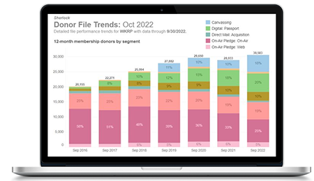 Sherlock dives deeper into a station’s donor file trends, delivering detailed, interactive analysis across multiple data sources. Blending giving data and streaming data with demographic data, there are literally hundreds of combinations to dynamically filter Sherlock’s suite of reports. Turn the dials and watch insights come alive, answering questions like these and more: