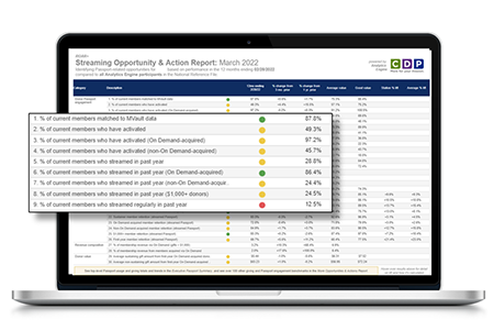 The Streaming Opportunity and Action Report (SOAR) includes 30 KPIs specific to Passport engagement and value like average gift and percentage of Passport donors who give sustaining gifts.