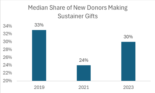 If listening is noticeably down, it stands to reason that new radio donor acquisition would suffer and the new sustainers among them. However, a phenomenon we noted during the pandemic and beyond was not only the decline in the number of new donors, but a decline in the share of those new donors that made sustainer gifts.