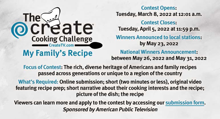 The Create Cooking Challenge: My Family’s Recipe is sponsored by American Public Television. NO PURCHASE NECESSARY. Open to legal residents of the U.S., District of Columbia, and U.S. Territories, age 18 or over. Begins 3/8/22 12:01 a.m. ET; ends 4/5/22 at 11:59 p.m. ET. Void where prohibited.