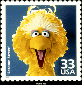 It's official: Sesame Street took its place as one of the 15 best-remembered icons of the 1970s on Nov. 18 [1999] with the issuance of a block of 33-cent postage stamps featuring the beady-eyed visage of Big Bird. The downside: you can't buy the Big Bird stamp separately from disco and smiley-face stamps. Big Bird celebrated its philatelic debut with a visit to NBC's Today show. As an icon of the 1970s, Sesame Street ranks second only to the Smiley Face, judging from a national vote held in 1998 by the U.S. Postal Service to select topics for new commemorative stamps.