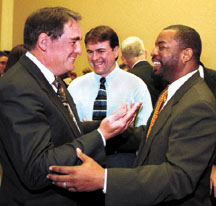 Commercial TV "will never make the best use" of the medium, LeVar Burton (right) told Chairman Tauzin (left). (Photo copyright 1999 by Robert Visser, Photopress Washington.)