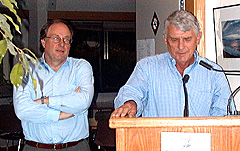 McGhee and his successor, John Willis (left), speak to WGBH staff, August 2002. (Photo: WGBH.)