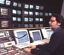 Merger talks followed an agreement to share WNET's new multistream digital master control. Above: Eulugio Ortiz at the switches. (Photo: Joseph Sinnott, WNET.)